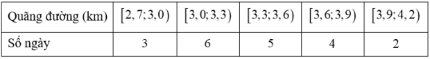 Mỗi ngày, bạn Chi đều đi bộ để rèn luyện sức khoẻ. Quãng đường đi bộ mỗi ngày (đơn vị: km) của bạn Chi được thống kê lại ở bảng sau: Quãng đường trung bình mà bạn Chi chạy được là?