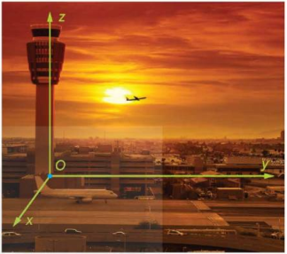 Để theo dõi hành trình của một chiếc máy bay, ta có thể lập hệ tọa độ Oxyz có gốc O trùng với vị trí của trạm kiểm soát không lưu, mặt phẳng (Oxy) trùng với mặt đất với trục Ox hướng về phía tây, trục Oy hướng về phía nam và trục Oz hướng thẳng đứng lên trời. Sau khi cất cánh và đạt độ cao nhất định, chiếc máy bay duy trì hướng bay về phía nam với tốc độ không đổi là 890 km/h trong nửa giờ. Xác định tọa độ của vecto biểu diễn độ dịch chuyển của chiếc máy bay trong nửa giờ đó đối với hệ tọa độ đã chọn, biết rằng đơn vị đo trong không gian Oxyz được lấy theo km.