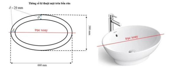Hình elip được ứng dụng nhiều trong thực tiễn, đặc biệt là kiến trúc, xây dựng, thiết bị nội thất,... Một bồn rửa (lavabo) bằng sứ có hình dạng là một nửa khối tròn xoay khi elip quay quanh một trục (hình minh họa). Thông số kĩ thuật của một bồn rửa: dài x rộng lần lượt là