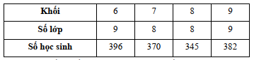 Bảng sau thống kê số lớp và số học sinh theo từng khối ở một trường Trung học cơ sở. Hiệu trưởng trường đó cho biết sĩ số mỗi lớp trong trường đều không vượt quá 45 học sinh. Biết rằng trong bảng trên có một khối lớp bị thống kê sai, hãy tìm khối lớp đó.