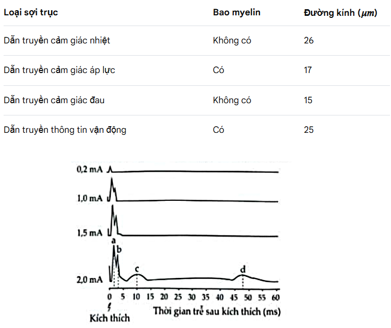 Thực hiện kích thích điện tại một đầu mút của dây thần kinh và ghi sóng điện ở đầu mút đối diện với 4 cường độ kích thích khác nhau (0,2 mA; 1,0 mA; 1,5 mA và 2,0 mA). Khi kích thích với cường độ 2,0 mA đã gây hoạt hoá đồng thời cả 4 loại sợi trục của dây thần kinh và quan sát được 4 đỉnh sóng điện (a, b, c, d) trong điện hoạt động hỗn hợp. Hình bên dưới thể hiện thời gian trễ sau kích thích của điện thế hoạt động hỗn hợp thu được.