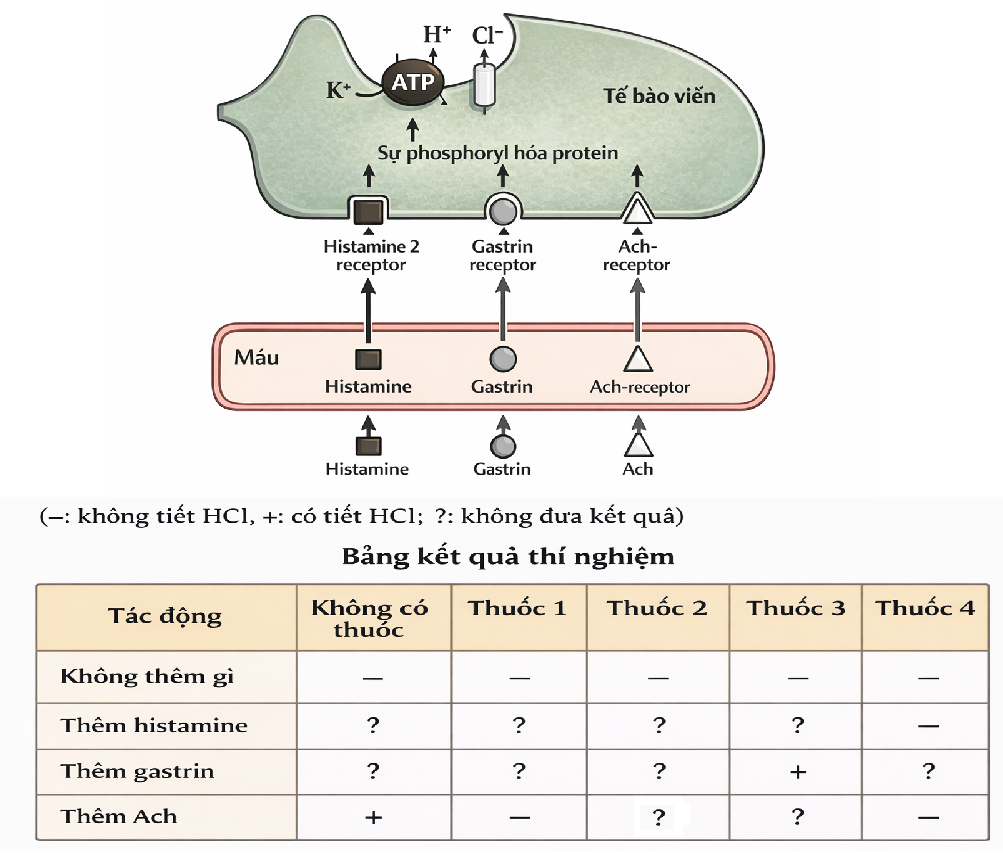 Thuốc 1 bất hoạt Ach receptor và thuốc 2 bất hoạt gastrin receptor.