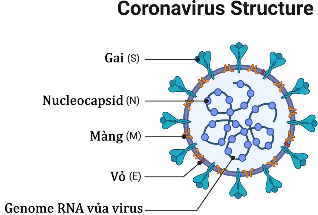 Hình bên mô tả cấu trúc của virus SARS-CoV-2 thuộc nhóm Coronavirus với vật chất di truyền là