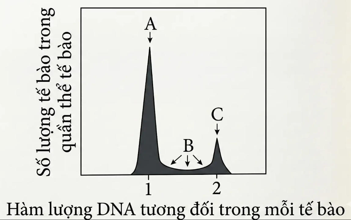 Một quần thể có các tế bào đang phân chia được nhuộm với 1 loại thuốc nhuộm phát huỳnh quang liên kết đặc hiệu với DNA. Hàm lượng DNA của mỗi tế bào riêng rẽ sau đó được xác định và biểu diễn với đơn vị tương quan với mức độ đơn bội của tế bào (kĩ thuật FACS). Tỉ lệ của các tế bào có hàm lượng DNA khác nhau được tìm thấy trong quần thể được biểu diễn như hình bên.