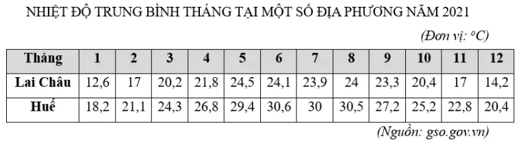 Căn cứ vào bảng số liệu, tính biên độ nhiệt năm của Huế cao hơn Lai Châu gần bao nhiêu độ C?