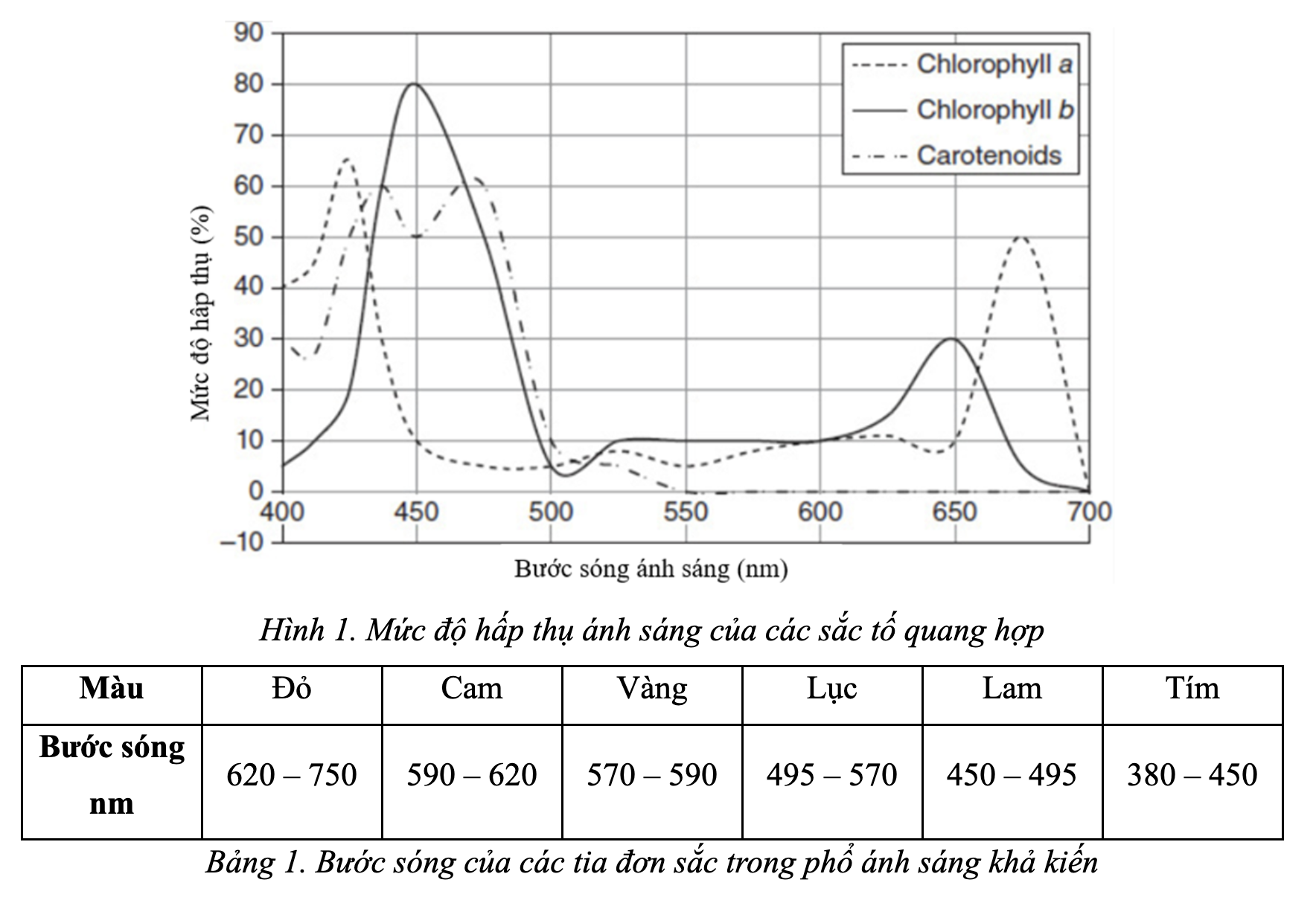 Quang hợp là quá trình thực vật, tảo và vi khuẩn lam chuyển đổi năng lượng ánh sáng mặt trời thành năng lượng tích lũy trong các liên kết hóa học. Diệp lục là sắc tố được các sinh vật tự dưỡng sử dụng để hấp thụ các bước sóng khác nhau của ánh sáng khả kiến từ mặt trời để sử dụng cho quá trình quang hợp. Có nhiều loại sắc tố quang hợp, chúng có các cấu tạo đặc biệt để hấp thụ được nhiều phạm vi khác nhau của quang phổ ánh sáng khả kiến và phản xạ các phạm vi còn lại. Phổ hấp thụ của chất diệp lục và các sắc tố phụ có thể thu được thông qua phép đo quang phổ và được sử dụng trong các phân tích về sự phát triển của thực vật, nhằm xác định sự phong phú của các sinh vật quang hợp trong nước ngọt hoặc nước mặn và đánh giá chất lượng nước. Số liệu trong hình và bảng dưới đây được thu thập bởi các nhóm sinh viên khi đo phổ hấp thụ của ba sắc tố quang hợp thường gặp. (Xem Hình 1) (Xem Bảng 1)