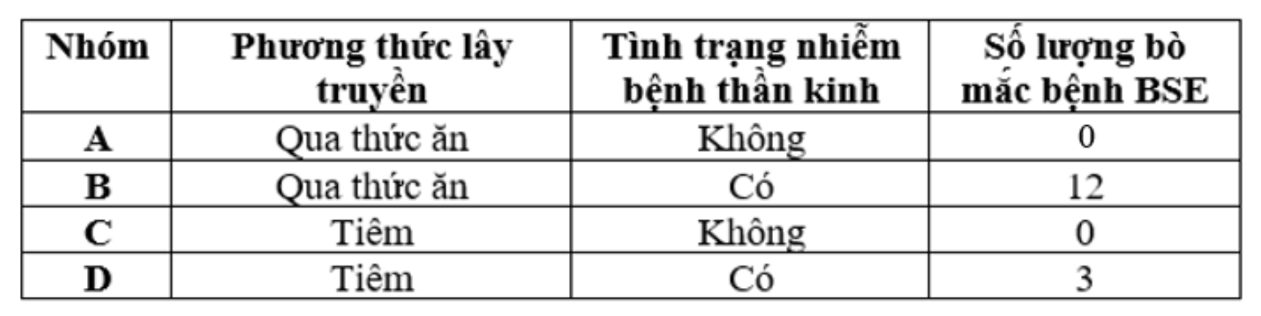 Dựa vào bảng kết quả thí nghiệm, cho biết nhóm bò có số lượng mắc bệnh BSE cao nhất thuộc nhóm nào sau đây?