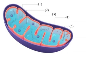 Hình sau mô tả về cấu trúc của ti thể, các thành phần cấu tạo tương ứng với các ghi chú trên hình là: