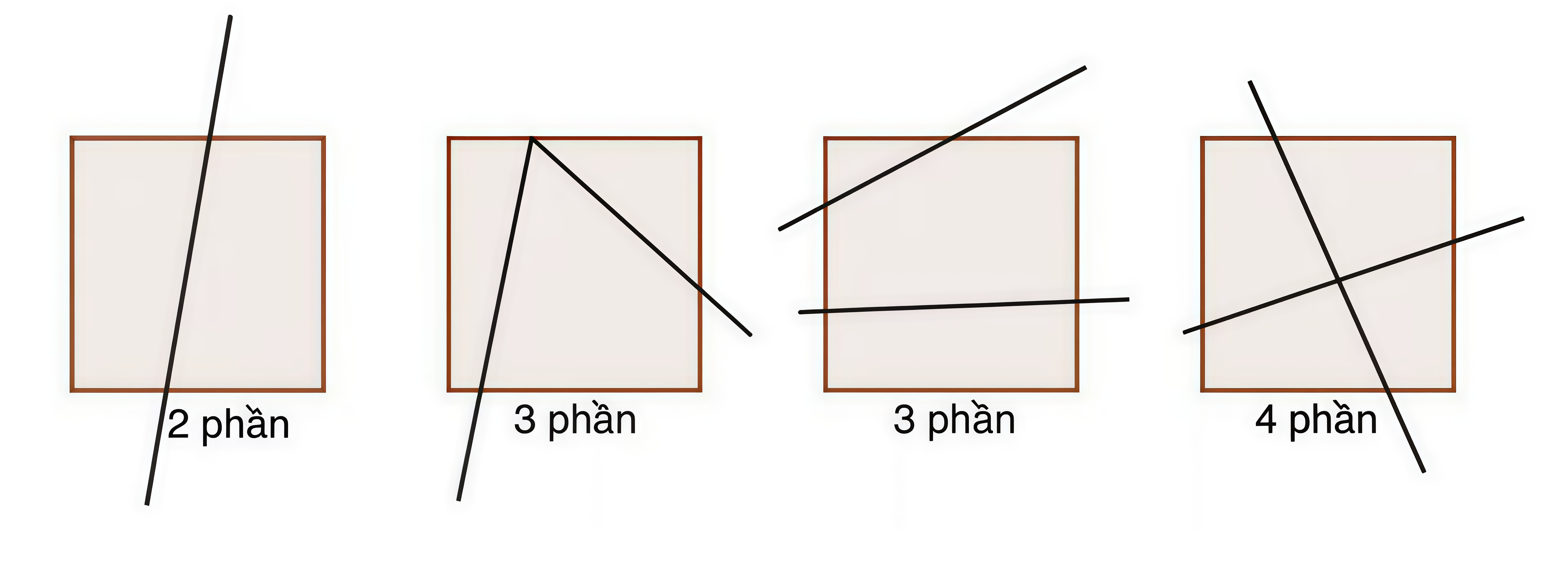 Đặt một cái dây lạt thẳng lên mặt chiếc bánh chưng hình vuông đã bóc thì chiếc bánh bị chia thành hai phần. Đặt thêm một dây lạt thẳng nữa: nếu hai dây lạt không cắt nhau bên trong (hoặc chỉ cắt nhau trên rìa) mặt bánh thì chiếc bánh bị chia thành 3 phần, còn nếu hai dây lạt cắt nhau bên trong mặt bánh thì chiếc bánh lại được chia thành 4 phần (xem hình minh họa). Chọn phương án điền vào chỗ trống để có mệnh đề đúng: "Nếu đặt 7 dây lạt thẳng thì chiếc bánh được chia thành tối đa bao nhiêu phần?"